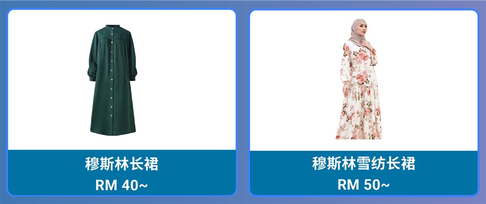 下图的两种款式的长裙既有穆斯林元素,又结合碎花、雪纺等时尚风格,深得马来女性消费者的心!