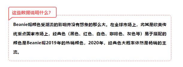 作为一款时尚单品,颜色、款式是Beanie帽大卖的重要影响因素,各国消费者都喜欢什么颜色呢?各大机构发布的年度色对于消费者买Beanie帽是否有指导意义呢?至少在2019年,各大机构预测的流行色未能预测到Beanie帽的流行色~
