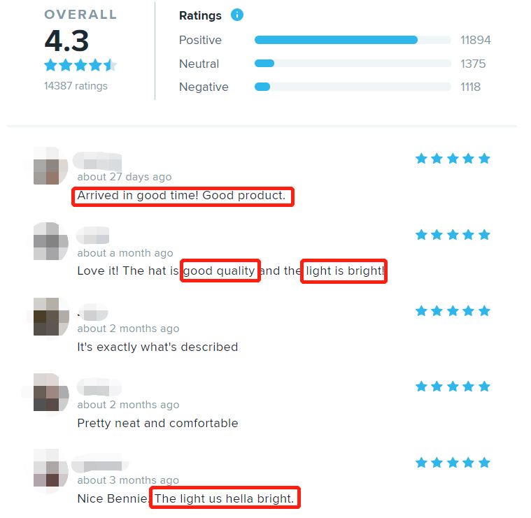 除了产品质量和物流时效外,上图款式的2019年旺季热销的Beanie帽产品,获得最多的评价就是独特的LED灯带给用户的额外体验了。尤其一位用户提到了自己70岁的父亲喜欢园艺,这款产品让他的父亲“still works out in his garden after he gets off work til past dark!(天都黑了还在花园里劳作)”。
