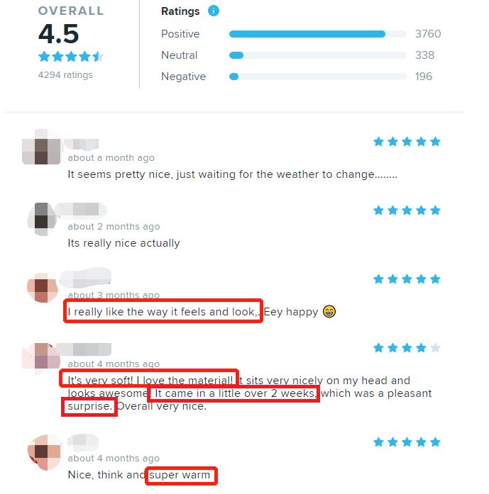 和上面2款旺季热卖产品相比,上图这个款式的Beanie帽产品获得了很多“soft”、“warm”相关的评论,产品材质、保暖的特性非常适合更加寒冷的天气,帽檐的一圈短毛也增加了温暖的感觉。在保暖这方面,产品给予了用户满足预期的体验;即使产品使用的是普通的直发物流,但较好的物流时效也给了用户额外的“惊喜”。