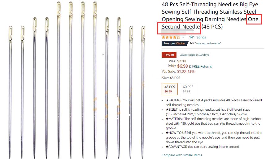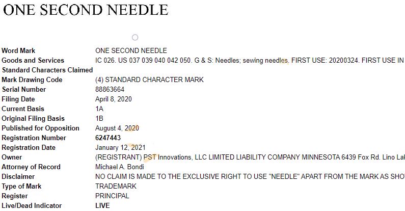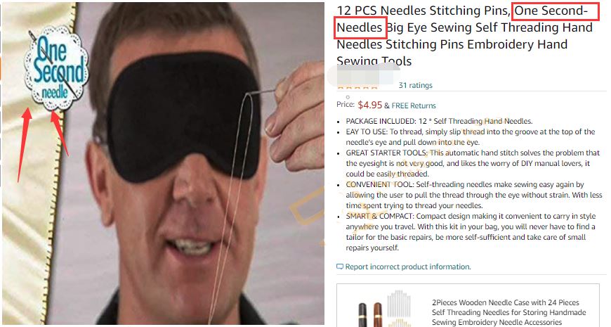 近日据卖家防御网消息,David律所又代理新品牌了,这次是一款新的TV产品:ONE SECOND NEEDLE盲人针线套装!TV产品指的就是那些在电视购物上面会出现的产品,很多都是生活用品。本案新鲜出炉,还没开始冻结,大家赶紧排查有无类似刊登,速度下架提现!