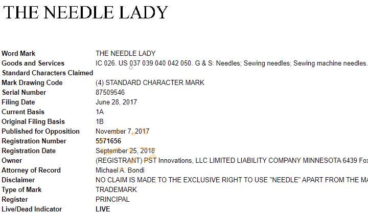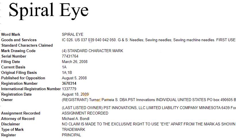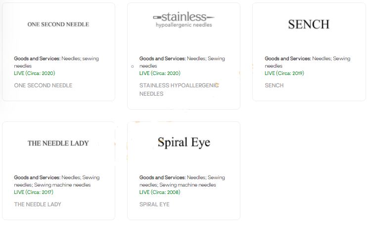 诉状中提及的主要是这三个文字商标:ONE SECOND NEEDLE, SPIRAL EYE和THE NEEDLE LADY ,注册大类均为026类: