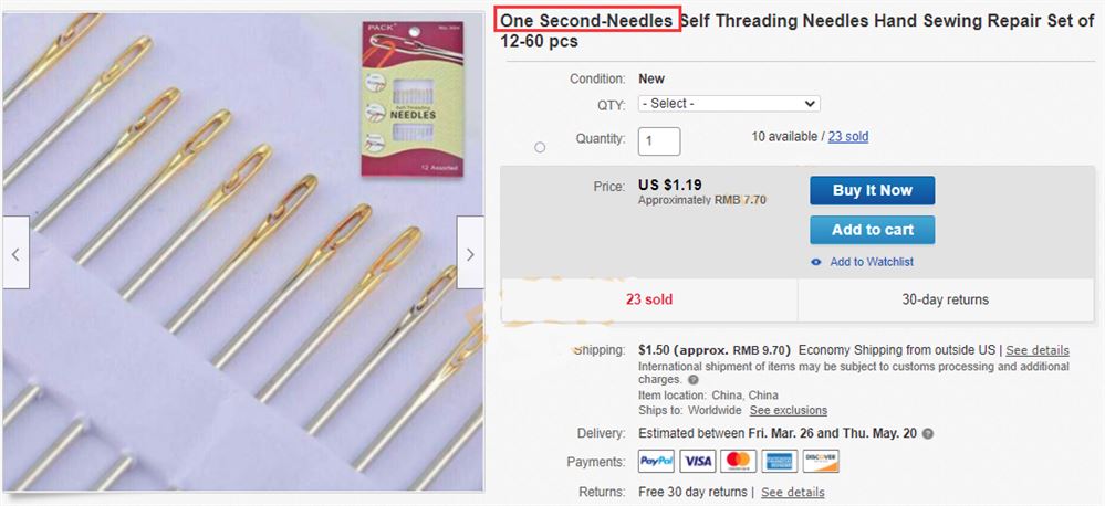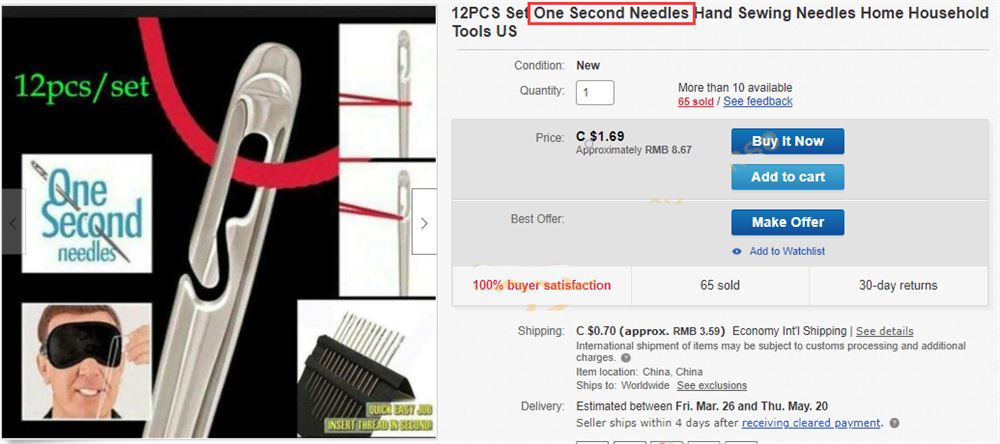 在各大平台直接搜索ONE SECOND NEEDLE,发现还是有很多中国卖家依旧在刊登相关产品,下图这个侵权非常明显: