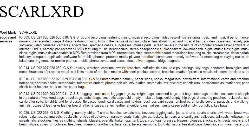 Scarlxrd注册大类:09,014,016,018,025,028,041