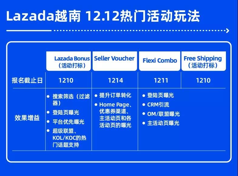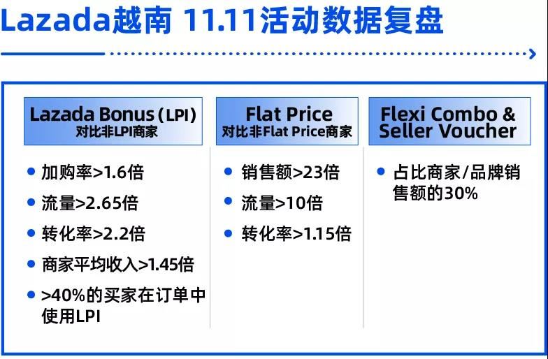 据Lazada11.11数据统计,价值超过6.3亿美元的Lazada Bonus购物津贴在11.11热卖开始前便被一抢而空,Lazada越南的每四个买家中就有一位在11.11的闪购(Flash Sale)中购买商品,10,000件闪购商品的销售额占比平台总销售额的30%,11.11参与Flat Price玩法的商家销售额,为未参加的商家的23倍可见Lazada的多种促销模式对消费者具有超强的吸引力。